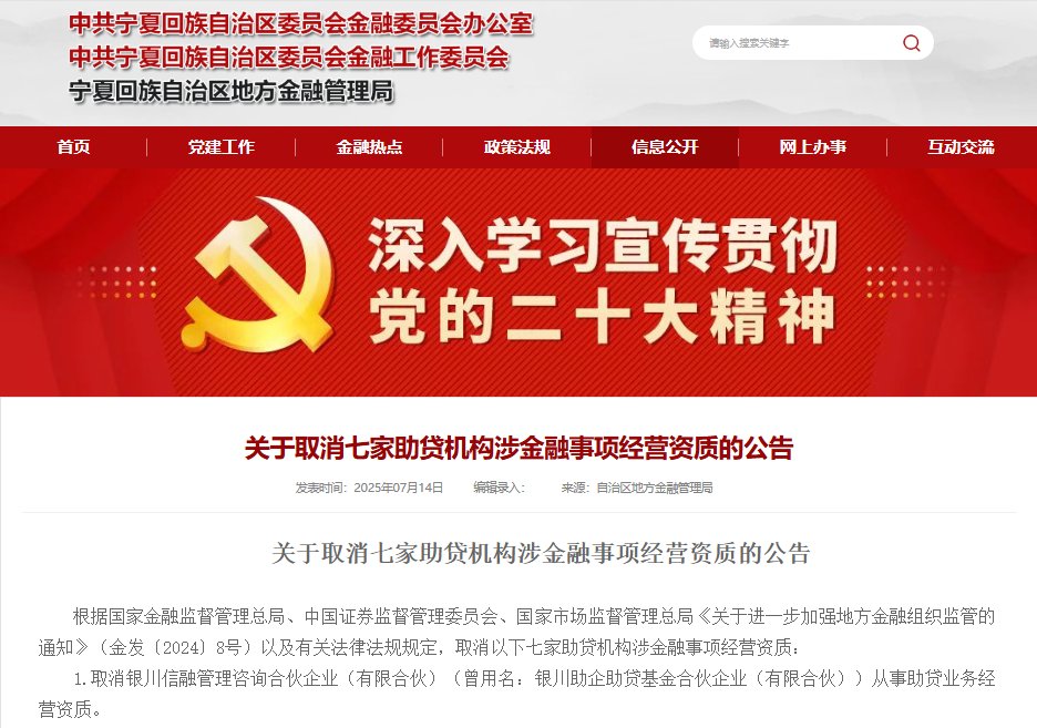 7月14日,宁夏地方金融管理局发布公告称,根据国家金融监督管理总局、中国证券监督管理委员会、国家市场监督管理总局《关于进一步加强地方金融组织监管的通知》以及有关法律法规规定,取消七家助贷机构从事助贷业务经营资质。这七家机构未经许可不得再开展相关涉金融事项业务,存续企业依旧可以依法从事各类常规经营事项。