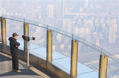 37秒,电梯便直升到65层。这层最大的亮点是可以体验“天空之镜”。“天空之镜”共有4个,每个长16米,特殊的镜面材质,倒映出的蓝天白云仿佛就在脚下。“站上去不像是站在悬崖边上,更像是融入了天空,有一种很梦幻的感觉。”津湾置业运营总监刘畅介绍,站在上面有种“天地同框”的梦幻效果。一位游客笑着说:“确实很美,但上去还是需要一些胆量的。”